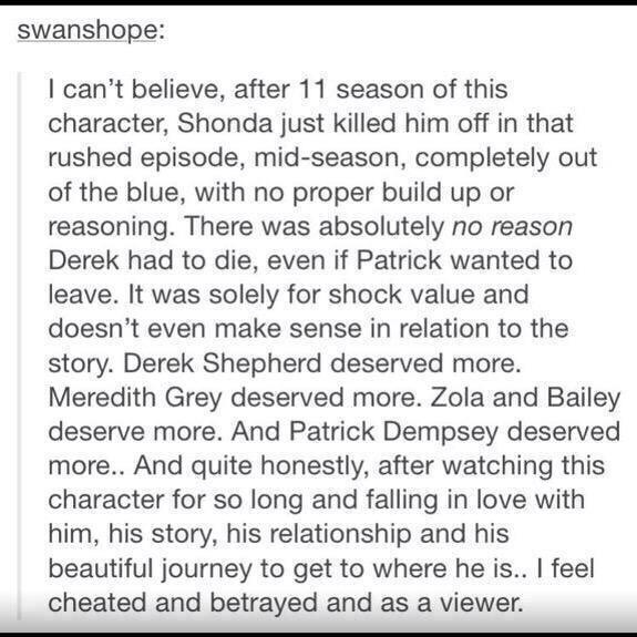 Derek shouldn’t have gone out like that. Why did he even have to die? He could’ve left for the woman he cheated with in DC. Haven’t we mourned enough beloved surgeons? I guess when you skip out on your contact that was supposed to go to season 12, the writers aren’t happy. Still it was pretty rough to see Mer have to unplug the love of her life while Chasing Cars by Snow Patrol played just like it did for Callie when she was in a car wreck in season 7, episode 18. If there were any justifiable teary moments in this episode it was the MerDer flashbacks, the history, the milestones, the pain and the bravery. If anything hurt is was that Meredith who survived so much; drowning, a bomb, a gunman, a plane crash, and an uncertain pregnancy, Meredith, child of darkness who said; “Look, it took me a long time to find him. A long time. And even then it took me a long time to even know that I wanted him. To be married, to be his wife, to have his kids. And now that I realized that, he’s lying on the table in there and my best friend’s hands are inside his chest.”-Season 6, ep. 24. He won’t “always show up” now. If there’s no coming up for fresh air, that only leaves drowning.