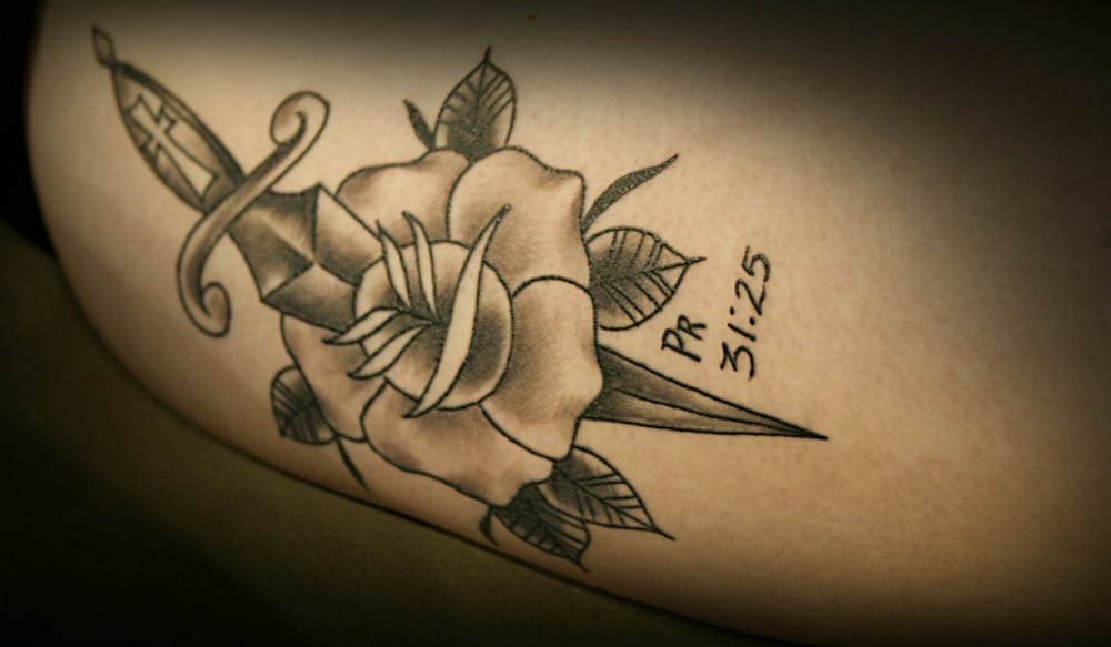 I told her I am getting the rose and dagger because it represents love and loyalty and fighting for what matters even when it’s hard. It makes me think of our relationship because things have not always been easy but they’ve always been worth fighting for. What used to be a massacre has now become something of a masterpiece and I think that is rather beautiful. I told her I was getting the bible verse Proverbs 31:25 because I believe it is the closest line in the description of what it means to be a godly woman that almost justifiably explains who she is as a woman, to me and to the world.