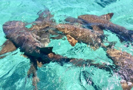 “Could you not? I’m literally in the ocean.” There were a few of them, copper, medium sized. One gently swerved about thirty feet under me. Breathe. We swam through that salty water for quite some time. Absorbing the underwater art. Soaking in the blue. This was the first stop of two. Getting aboard the boat again, in the back of my mind, I was afraid I’d get chopped up in the propeller. I know of someone who actually died that way. I did ram my hip into it at the beginning of the excursion, a hard ram into the metal. I’m really good at that sort of thing. I was so convinced I was bleeding I made my mom check. No blood. I did not become ceviche that day. I was lifted back in, wet like a raisin and given a towel. I hate that feeling, the chill that comes with damp skin. The crowd cheered when asked how it was. Then we were off to feed the sharks. Feed them? I’m not feeding them. Who’s feeding them? Can we not feed them? Can someone feed me tequila? If I’m gonna get eaten I’d rather not feel it. The dare didn’t specify my sobriety. The boat went out further into the sea. Tons of open water. They said there would be chum in the water and the sharks would come quickly but they won’t stay long. The sharks were Nurse sharks which apparently, are not aggressive but I did read they suck and twist chunks of flesh off their prey. Why am I doing this again? Oh, because I have too much pride to turn down a dare. Sharks are my biggest fear, if I conquer this, I’ll be fearless. They did not specify how many sharks there would be and I’m glad they didn’t because if they would’ve told me I’d be bobbing amongst 40-50 sharks I would’ve stayed in the boat. They were everywhere. Clusters of copper fins, congregating wherever the chum was. My brother got hit in the head with chum. I watched groups of twos and threes swim under the boat.