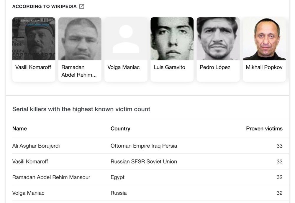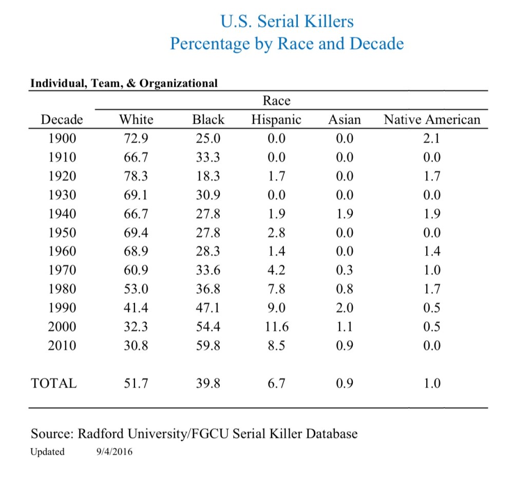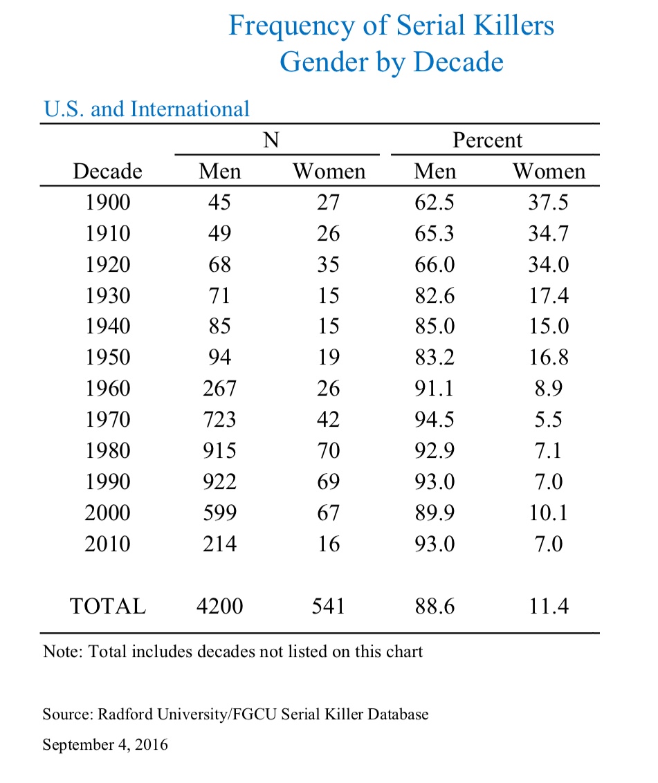 Vronsky cites statistics indicating that nearly one in six (16 percent) of serial killers apprehended in the United States since 1820 was a female, either acting alone or as a partner of a male or female offender. What about race? Are they all white? A 2014 Radford/FGCU Serial Killer Database annual statistics report indicated that for the decades 1900–2010, the percentage of white serial killers was 52.1% while the percentage of African American serial killers was 40.3%.
