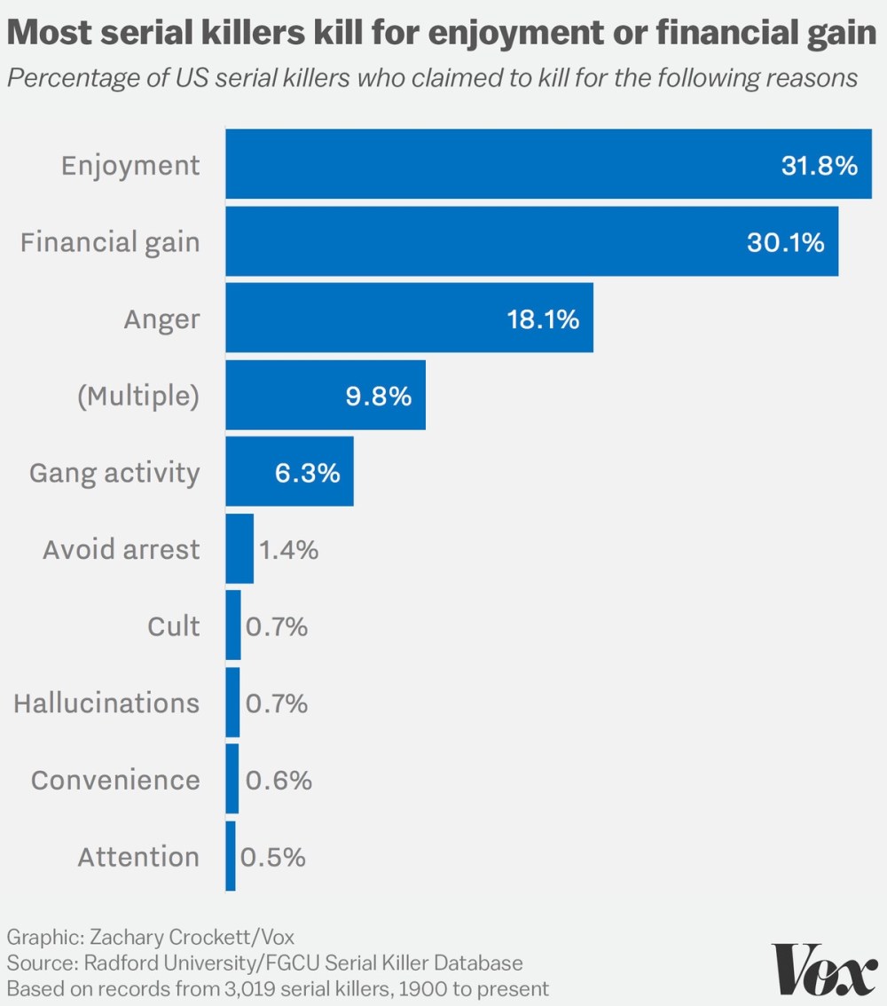 Serial killings account for no more than 1 percent of all murders committed in the U.S. Based on recent FBI crime statistics, there are approximately 15,000 murders annually, so that means there are no more than 150 victims of serial murder in the U.S. in any given year.Oct 24, 2014