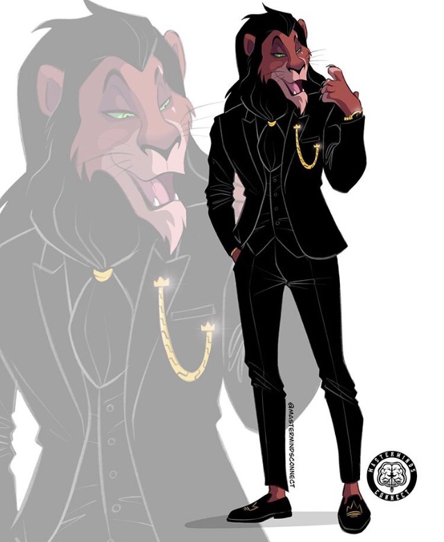 When this series hit the internet, it was a rendition of the renowned anthropomorphic animals that we didn’t know we needed. Scar was the first to hit Instagram on March 20th, 2020. Dressed in black from mane to loafers, a gold crown embroidered on each shoe, complimenting his gold chain and tie towards the bottom of his mane, resembling the look of an ascot.